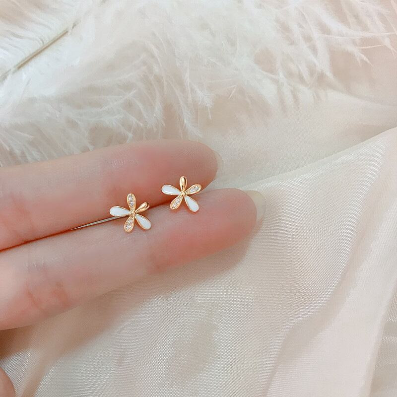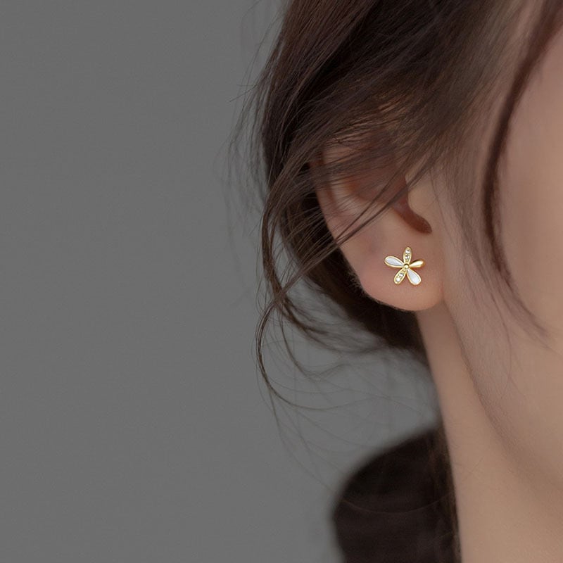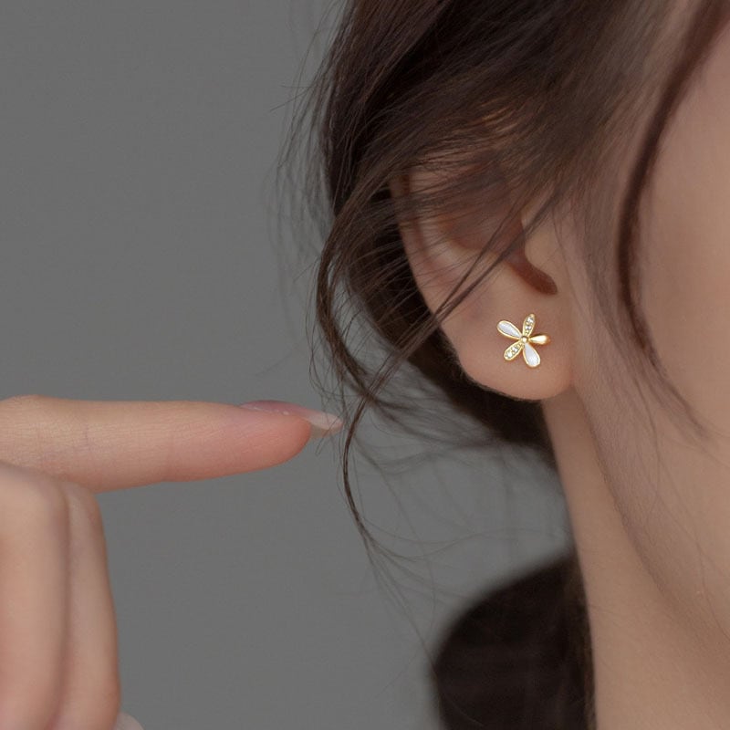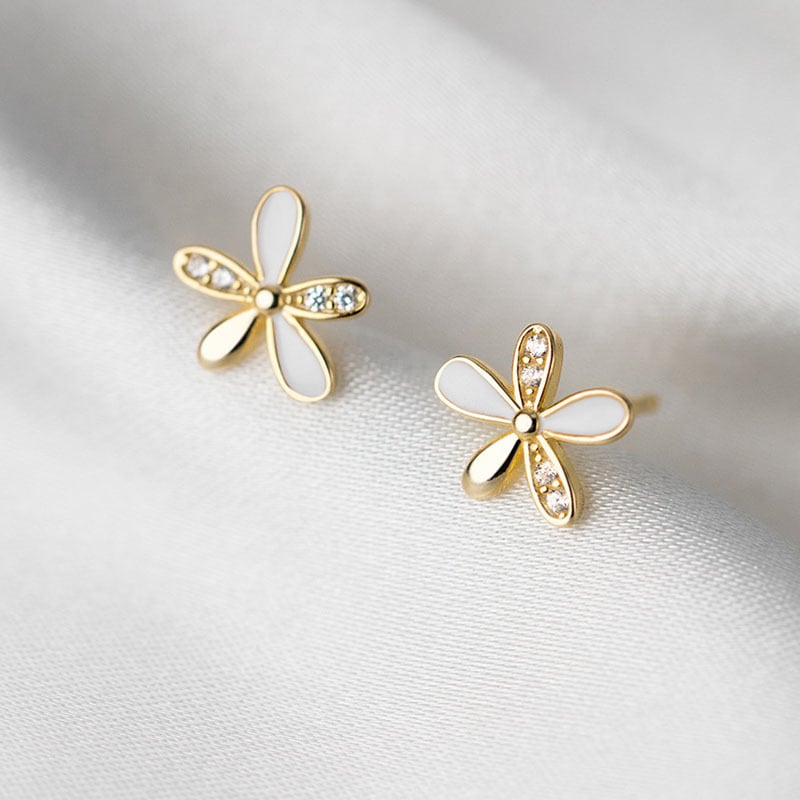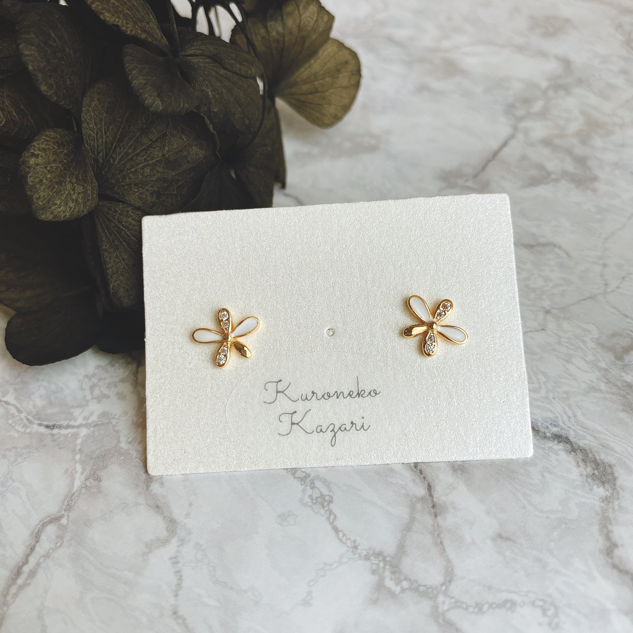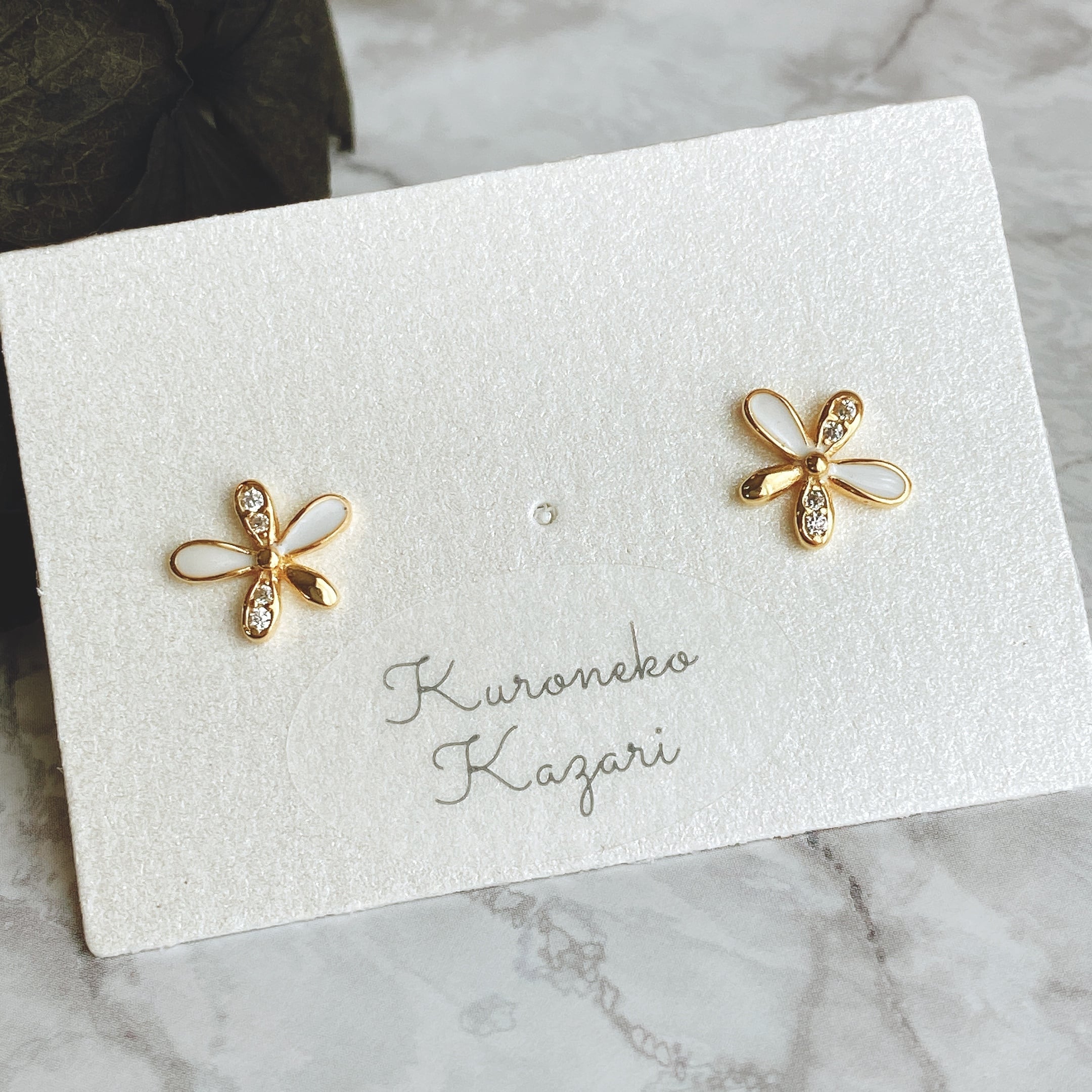 白とラインストーン&ゴールドの花びらが個性的なピアスです。